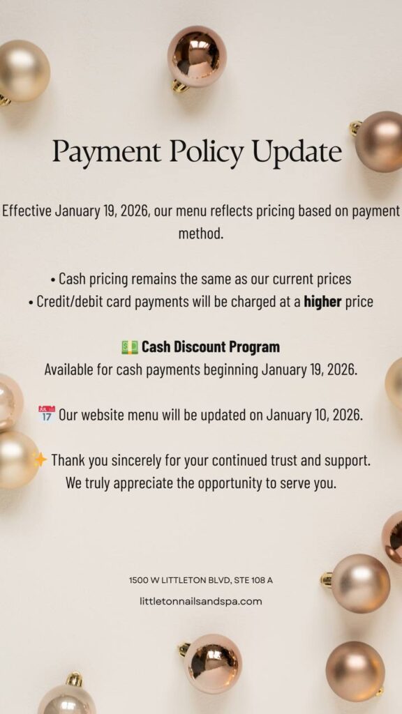 2. EXPRESS PEDICURE Indulge in our essential pedicure, featuring a soothing foot soak, nail trimming & shaping, and a slight heel rubbing. Additionally, your feet will get hydrating massage and your preferred polish choice. | $35 | $38 |